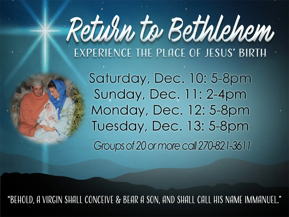 Mark your calendars for Return to Bethlehem, our biggest event of the year! Come experience and walk through the city of Bethlehem on the night Jesus was born. It's a wonderful way to begin the Christmas season with your family and friends.