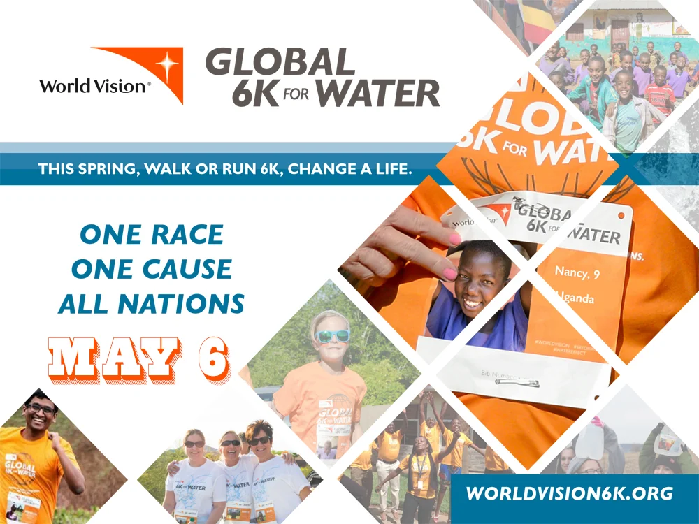 On May 6 join thousands of people around the world to change lives. It's simple, you can walk, run, or even push a stroller in World Vision's Global 6k for Water and provide clean water to one person! The 6k is the perfect opportunity for families to work together to fight global poverty and to teach children about the water crisis & how they can help by walking or running 6k. Challenge your small group, youth group, Sunday School group, etc. to act on the mission God has called us to by providing clean water to those without access to it. However you cross the finish line, you'll know you've made a difference to someone in need. Registration costs $50, which provides clean water to one person.